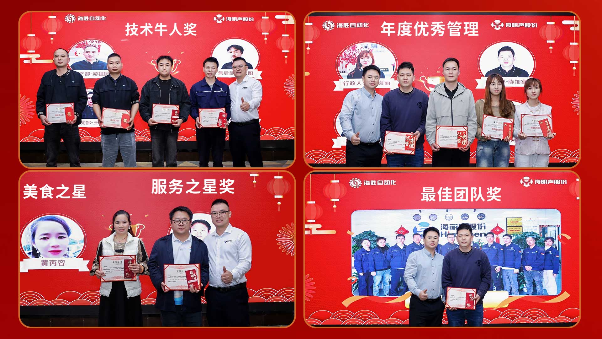 頒獎(jiǎng)儀式貫穿整個(gè)下午,共設(shè)置12個(gè)獎(jiǎng)項(xiàng)類別,涵蓋個(gè)人貢獻(xiàn)、團(tuán)隊(duì)協(xié)作及長期服務(wù)等多個(gè)維度。在個(gè)人獎(jiǎng)項(xiàng)方面,兩公司分別評(píng)選出年度優(yōu)秀員工、進(jìn)步之星、最佳新人、年度銷售冠軍、技術(shù)牛人及年度優(yōu)秀管理者;同時(shí)設(shè)立美食之星與服務(wù)之星專項(xiàng)獎(jiǎng),關(guān)注員工在不同崗位的專業(yè)表現(xiàn)。